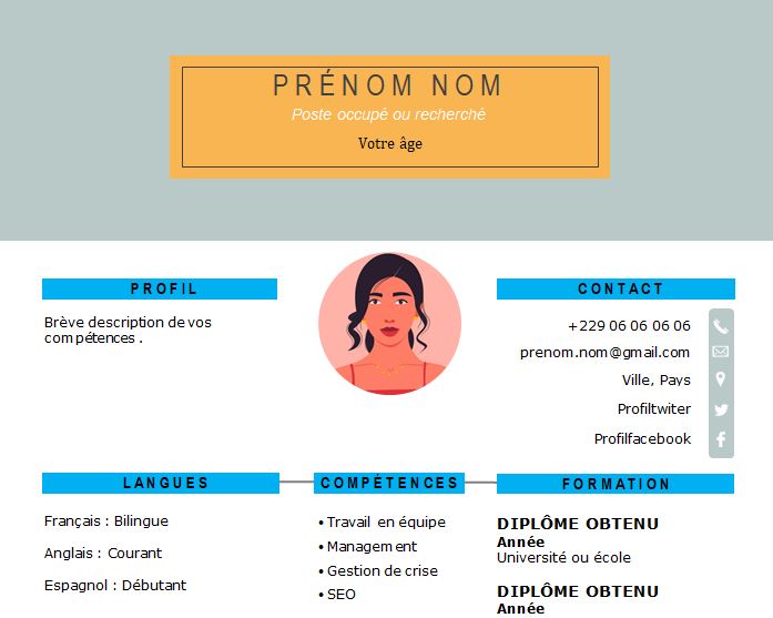 CV attrayant adapté pour toutes vos candidatures professionnelles : recherche d’emploi , de stage ou de job . Téléchargez-le . Modèle de CV téléchargeable et modifiable en version Microsoft Office Word.